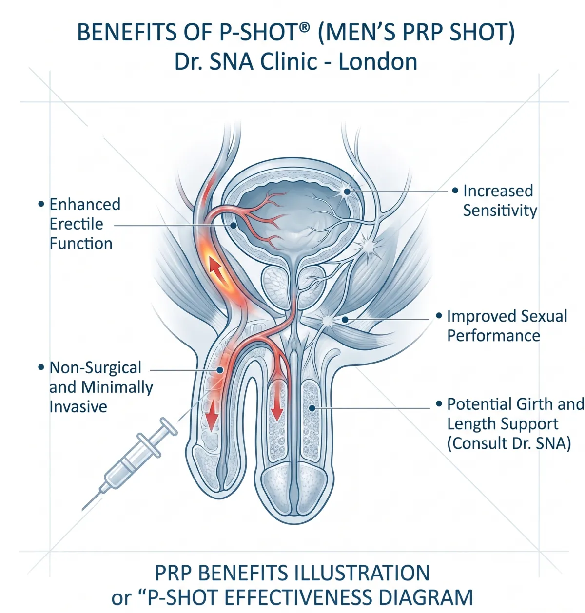 The P-Shot, formally known as the Priapus Shot, is a non-surgical treatment that uses platelet-rich plasma (PRP) drawn from your own blood. A small sample is taken from your arm, processed in a medical-grade centrifuge to concentrate the growth factors, and injected into targeted areas of the penis using ultra-fine needles. The growth factors stimulate new blood vessel formation, support nerve fib